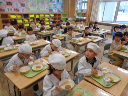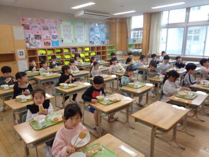 小学校で初めて給食を食べました。子供たちからは、「美味しい」「おかわりしたい」といった声が聞こえてきました。