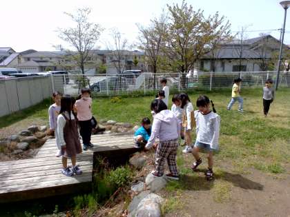 青空の下、プレイグラウンドでたくさん遊びました。鉄棒やジャングルジム、草花や池の観察など、一人ひとりが楽しく過ごすことができました。