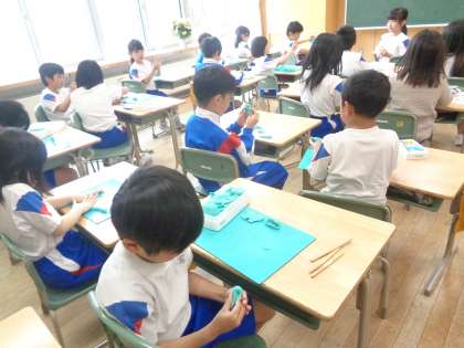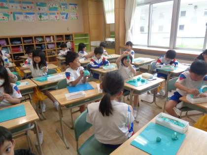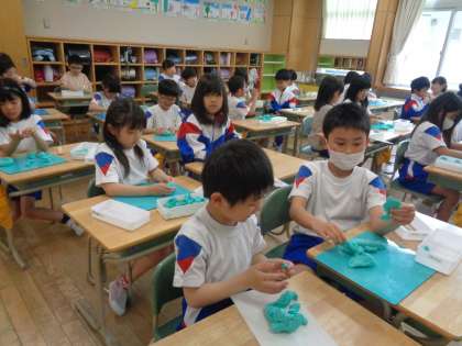 にぎった形をいかして、生き物をつくったり、楽器をつくったりしていました。