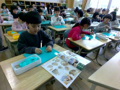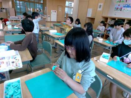 粘土をにぎって見えた形から想像したものをつくりました。様々な場所から観察して何に見えるかを考え、友達とできたものを話しながらつくっていました。