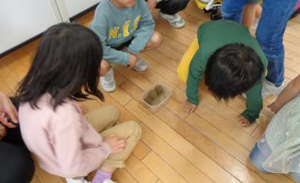 今日のききあいタイムでは、今、班で夢中になっている人が多い「どろだんごづくり」についての話がでました。つくっている人の話を聞いたり、実際につくっただんごを見たりして、「こんなきれいなだんごをつくれるなんてすごい」「ぼくもやってみたいな」とそれぞれの思いを膨らませました。