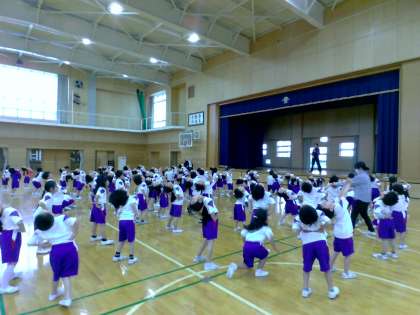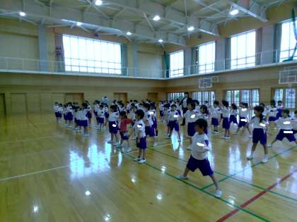 運動会に向けてラジオ体操をしました。手や足をしっかり伸ばし、大きく体を動かして行いました。
