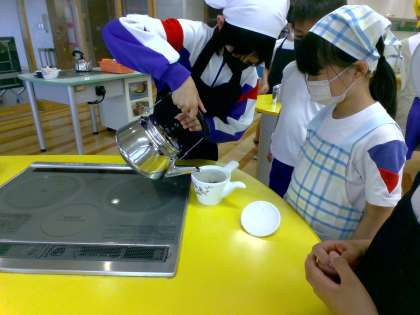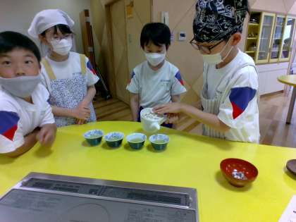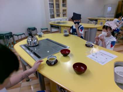 初めての調理実習を行いました。茶菓子と一緒にお茶を楽しみました。緑茶とあんこの風味をゆっくり味わって、満足そうでした。