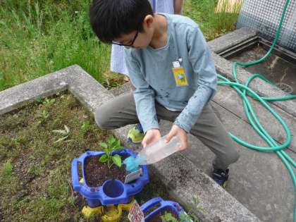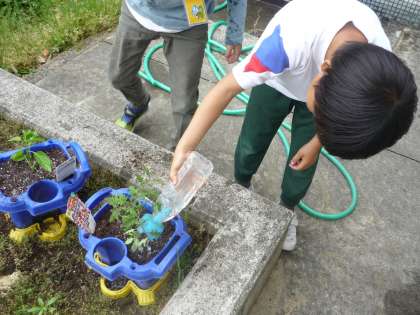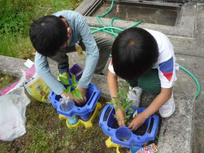 自分で選んだ野菜の苗植えをしました。「たくさん水をあげたいな」「実ができたら、〜にして食べたいな」と、思いを膨らませながら植えました。
