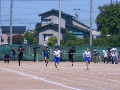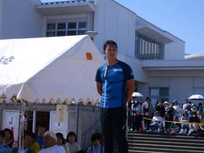 スペシャルゲストに陸上100m、200mの県記録保持者の福島聖選手を招いて、スポーツ交流を行いました。福島選手の本物の走りに大きな歓声が上がっていました。