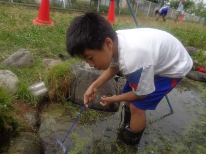 プレイグラウンドにある水辺パークをよりよいものにしたいと願い、活動しています。「池の水をきれいにしたい」「メダカなど、今水辺パークにいる生き物を大切にしたい」など各々に思いをもって掃除をしています。