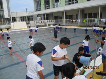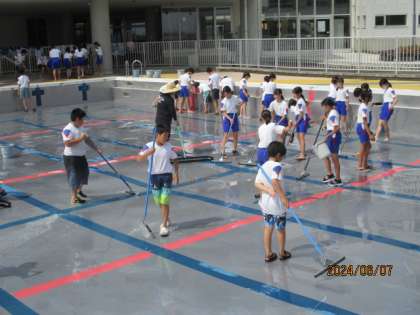 6年生は、みんなでプール清掃を行いました。ブラシやたわしで汚れをこすり、見事にぴかぴかになりました。今年度のプール開きが楽しみです。