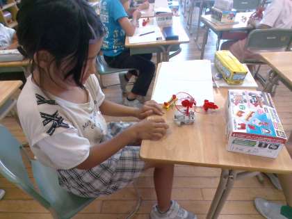 理科の授業では、電流のはたらきの勉強をしています。プロペラを作って電池の向きによって回る向きが変わることを見つけていました。