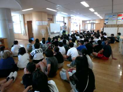 いよいよプール学習が始まりました。全体で安全等について話を聞いたあと、プールに入って楽しみました。