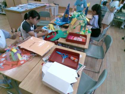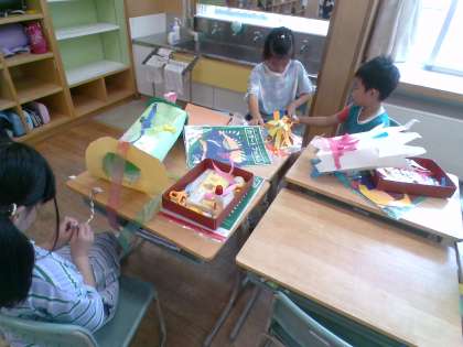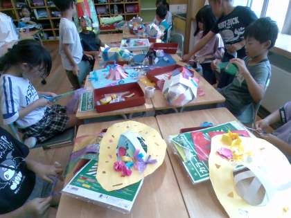 自分の想像した帽子をつくる活動もいよいよ終盤。どんな帽子が完成するのかとてもたのしみです。
