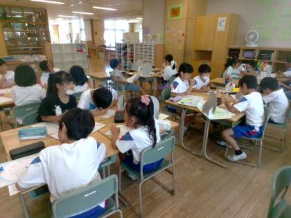 図画工作科では、わりピンワールドを作成しました。今回は、友達の作品のよさを見つけ発表をしました。
