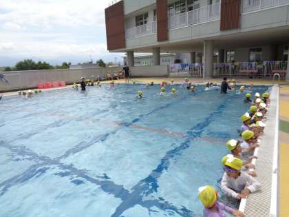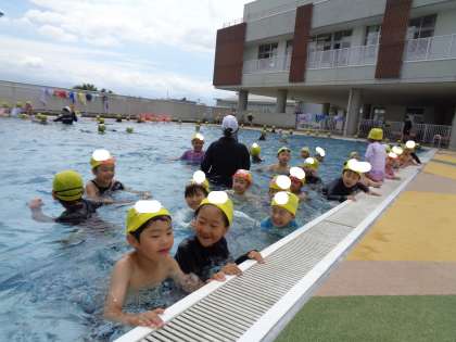 学校に入学し、初めての水泳学習を行いました。水泳学習のきまりや使い方などを学びました。子供たちは、「潜ることができるようになりたい」「泳げるようになりたい」と自分に合った目当てをもって学習に取り組んでいます。
