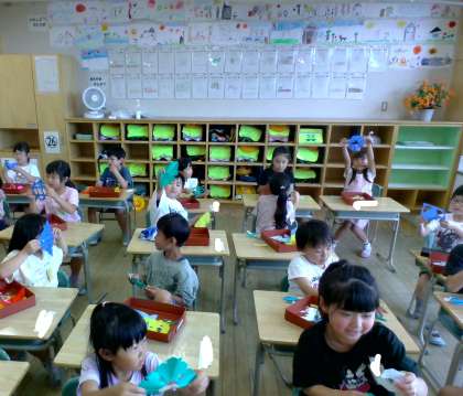 「ちょきちょきかざり」を行いました。折り紙を四つ折りや八つ折りにし、一人一人がはさみで切り込みを入れました。「どんな柄になるのかな?」「思っていたのとは違うけど凄いものになったよ」といった声が聞こえました。