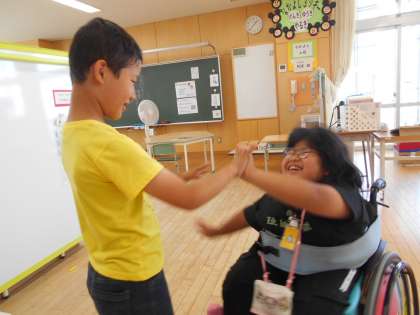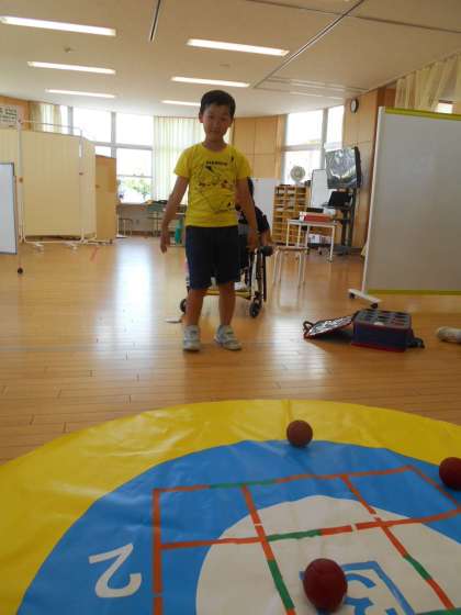 自立活動の時間に「2人でチャレンジ」という活動に取り組んでいます。くじで引いたお題にチャレンジしています。「ボッチャビンゴ」では、何回も失敗しましたが、成功しました。成功したら、2人でハイタッチです。すてきな笑顔です。