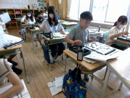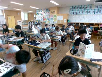 点画のつながりに気をつけて、「ふるさと」を清書しました。ひらがなの形に難しさも感じながら集中して取り組みました。