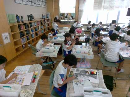 図画工作科では、「あの日・あの時の気持ち」を学習しています。感じたことを絵の具で表現する中で、よりよい筆の使い方や絵の具の混ぜ方を考えています。