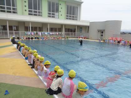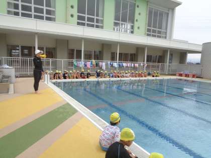チーム毎に分かれて水遊びの学習をしました。みんなで水に慣れようと一生懸命取り組みました。