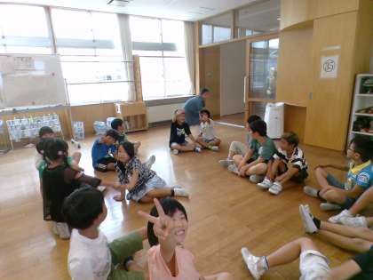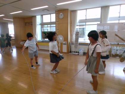 今日はドッジボール大会を企画していましたが、暑さが厳しいため教室で過ごすことになりました。教室では、みんなでハンカチ落としをしたり、縄跳びをしたりとそれぞれが楽しんでいました。