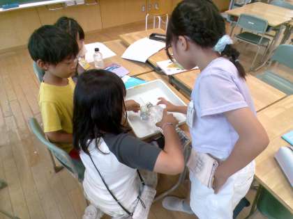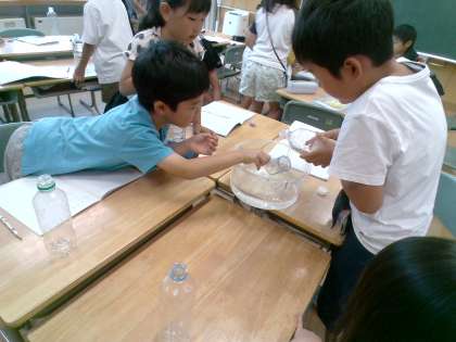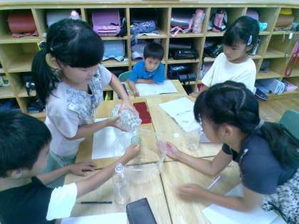 お家から持ってきたペットボトルにどれくらいの量の水が入るのか調べました。予想を立てたあと、班で協力して、何dLになるのか調べています。