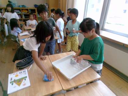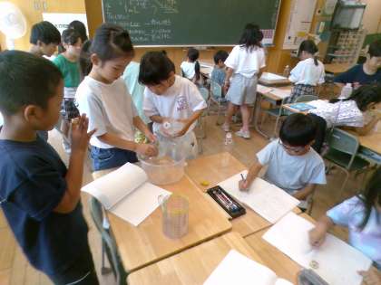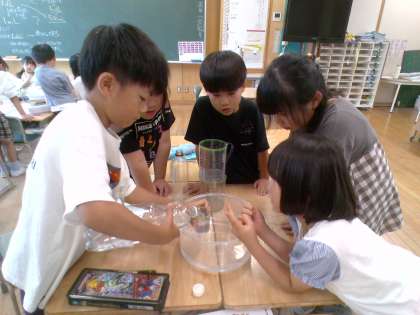 昨日に引き続き実験をしています。今日は、昨日より詳しく知りたい、大きなマスを使って調べたい。と自分たちで目当てを決めて考えました。
