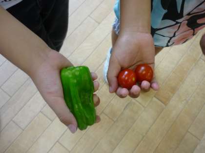 美味しそうなトマトとピーマンを収穫しました。「家族にも食べさせてあげたいな」「どんな料理にして食べようかな」と、嬉しそうな子供たちでした。