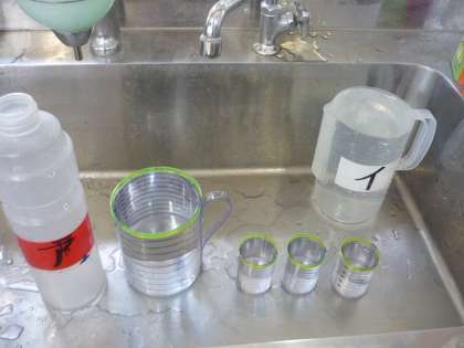2つの容器のうちどちらが多く水が入るか予想し、1Lや1dLのますを使って水のかさを量りました。「予想と違っていたね」と、驚いた様子の子供たちでした。