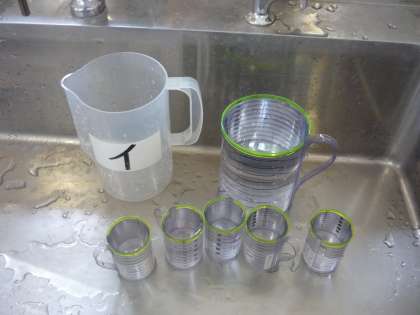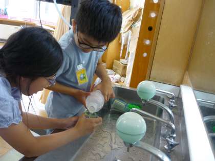 2つの容器のうちどちらが多く水が入るか予想し、1Lや1dLのますを使って水のかさを量りました。「予想と違っていたね」と、驚いた様子の子供たちでした。
