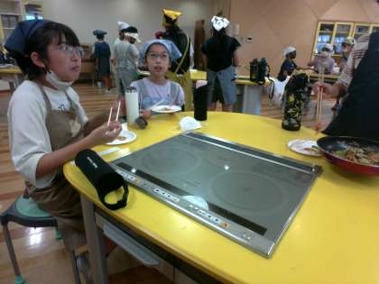 6年生は、彩り野菜炒めを作りました。にんじんやピーマンなど、彩り鮮やかな野菜やハムなどを仲間と協力して切ったり、味付けしたりしました。