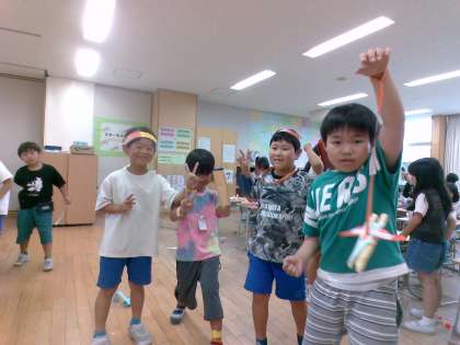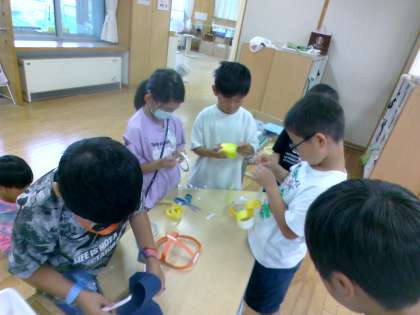 色紙や画用紙を細長く切り、輪っかを作って着飾っています。「悪い人を逮捕する手錠を作ったよ」「雷の神様になれる帽子を作ったよ」など、各々がイメージを膨らませながら楽しく活動しています。