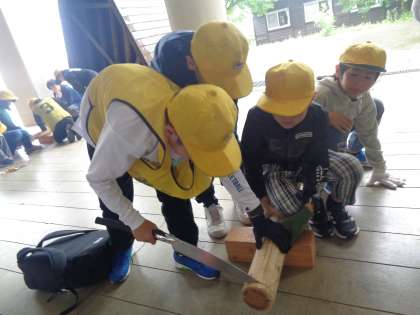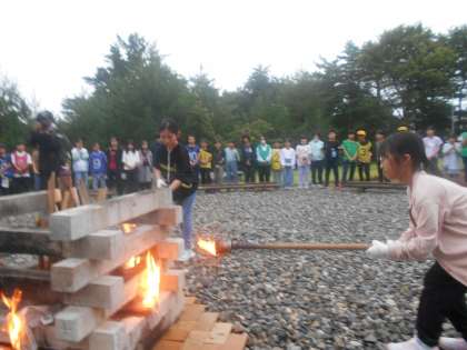 出発式では、校長先生から激励のお言葉をいただきました。午前中は、班のみんなで協力して丸太を切り、コースターを作りました。夕方からは、キャンプファイヤーを行いました。途中が雨が降ったので、火の神を迎え、点火をしました。