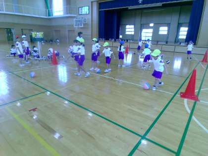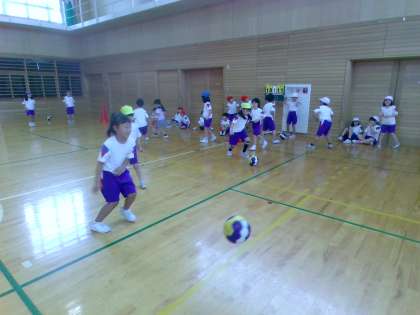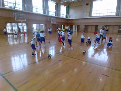 体育科ではサッカーをしています。インサイドキックでボールをコントロールしながらゴールを目指しています。チームの中でゴールを狙う人、ボールを回収する人など役割を決めながら楽しく活動しています。