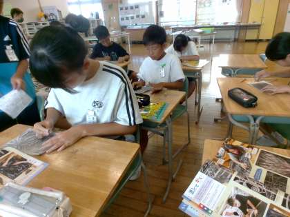 消しゴムを使って、花火をかきました。消しながらかくという作業の難しさを感じつつも、黒と白だけの色で表すことの楽しさを味わいました。