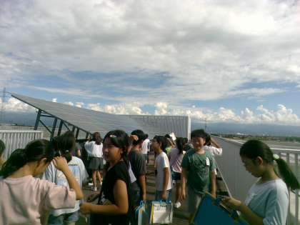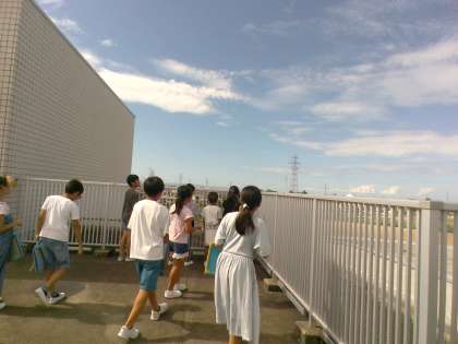 学校の屋上に行って月を観察しました。残念ながら雲に隠れて月は見えませんでしたが、方位磁針を使って方角を確認しました。