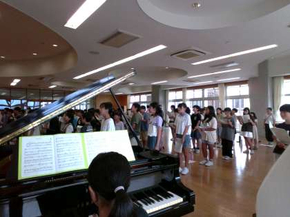 歌詞の発音の仕方を確認したり、盛り上げる箇所を揃えたりして、全体の合唱練習をしました。最初は眠たそうな様子でしたが、徐々に目や口が開いてきて、よりよい練習になってきています。10月に向けて毎日Step Up!しています。