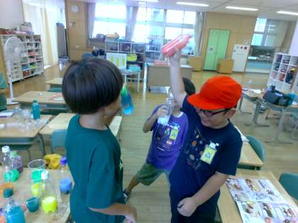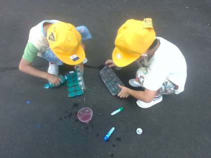 自分が作りたい色水ができるように、何度も挑戦したり、友達に教えてもらったりしていました。作ったあとは、友達と見せ合ったり、ジュースに見立てて乾杯したりして楽しみました。