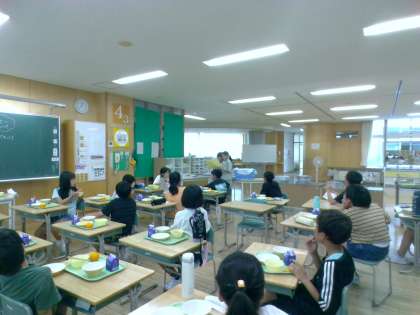 4組「みんなでチャレンジ」のあいさつチームが給食時間にあいさつ隊のお知らせにいきました。4年生からあいさつを広めることができるように自分たちで活動を進めています。