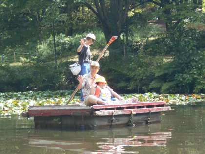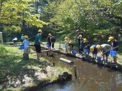 午前中は、グループごとにいかだ遊びをしたり、ジュースを飲んだり、ザリガニつりをしたりしました。