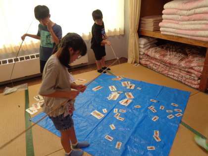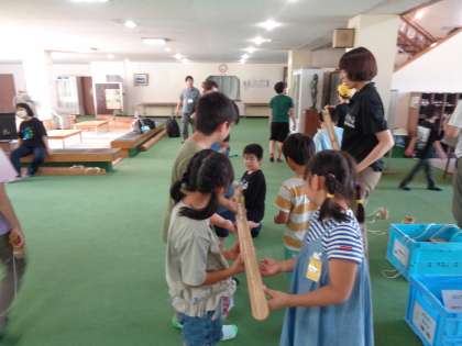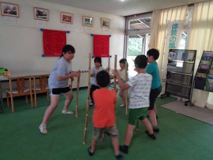 午後は、グループごとに、呉羽青少年自然の家ならではの「バンブーチャレンジ」で、竹で作った道具を使って課題に挑戦したり、自由に遊んだりしました。互いに声をかけながらリズムを取る等、しおりの合い言葉「まとまるくん」で取り組む姿を沢山見ることができました。