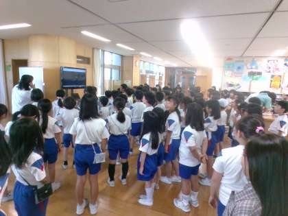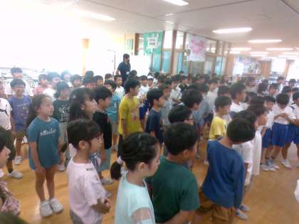 毎週火曜日の朝に学年音楽で歌を歌っています。今日は声を同じ場所に集める練習をしました。