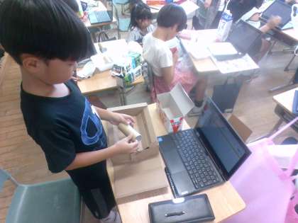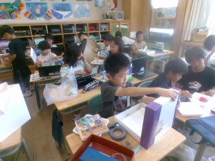 図画工作科では、「不思議なたまご」から生まれた「小さな友だち」の家を作ります。子供それぞれが用意した「小さな友だち」がどんなところに住んでいるか、好きなところはどこなのかを想像して箱を組み合わせています。「高いところまで登れる家がいいな」「暗い部屋も作ってあげたいな」とイメージを膨らませています。
