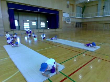 マット運動をしました。くま歩きやアザラシ歩き、うさぎ跳びや丸太転がりなど体を大きく使うことができました。