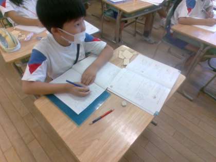 算数では図形の性質について学習しています。三角形と四角形の違いについて辺や頂点等の用語を使って説明できるようになっています。