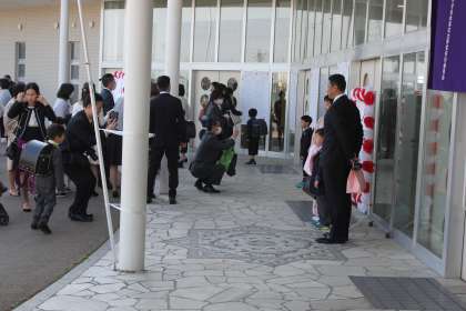 さわやかな天気の下、豊田っ子たちの入学式を行いました。まずは、玄関での記念撮影です。みんな、とてもいい顔をしています。