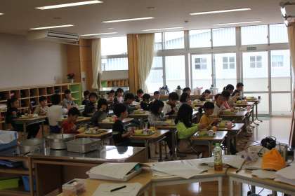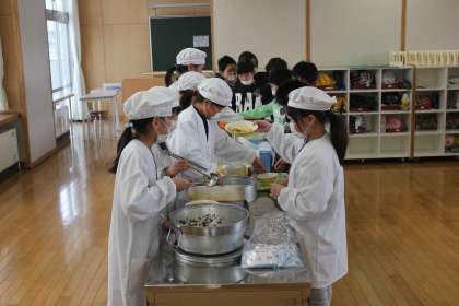 今日から2〜6年生の給食が始まりました。メニューは「ごはん、牛乳、ひじきあえ、たまごロール、ベーコンじゃがいもののにこみ、しらすつくだに」でした。にこにことした笑顔が教室いっぱいに広がっていました。
