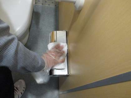 学校では毎日放課後に、コロナ対策として「トイレのドアレバー」「トイレットペーパーカバー」「流し用レバー」「蛇口」等、子供たちが触るところを消毒しています。