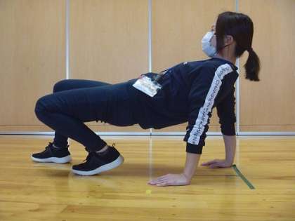 手と足で進む運動です。まず、手のひらと足の裏全体を床に付けます。そして、床に触れないようにお尻を上げます。