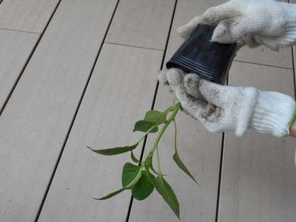 ポットから苗をそっと取り出します。根が伸びている様子が見えますよ。よく観察してみてくださいね。