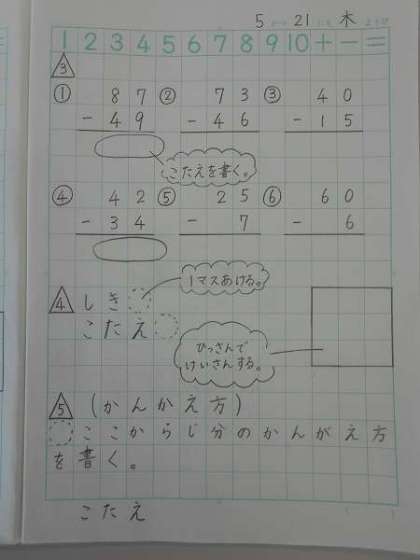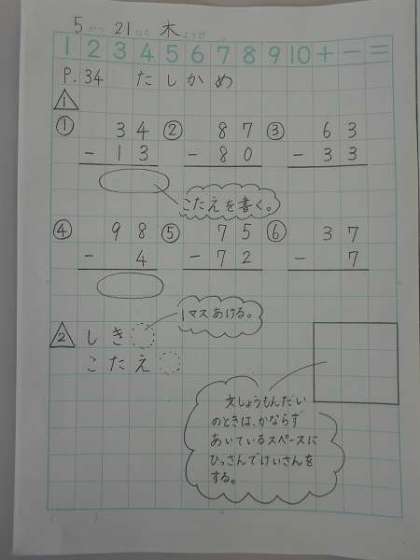 算数の教科書34ページの「たしかめ」は、ノートに書きましょう。