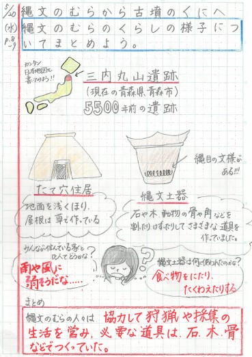 今日の社会の学習は、縄文時代についてですね。教科書を読んで、ノート学習を進めましょう。ノート例を参考にしてください。