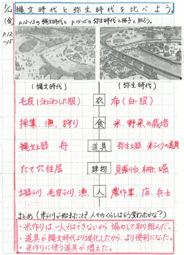 今日の社会の学習は、「縄文時代と弥生時代の比較」でしたね。